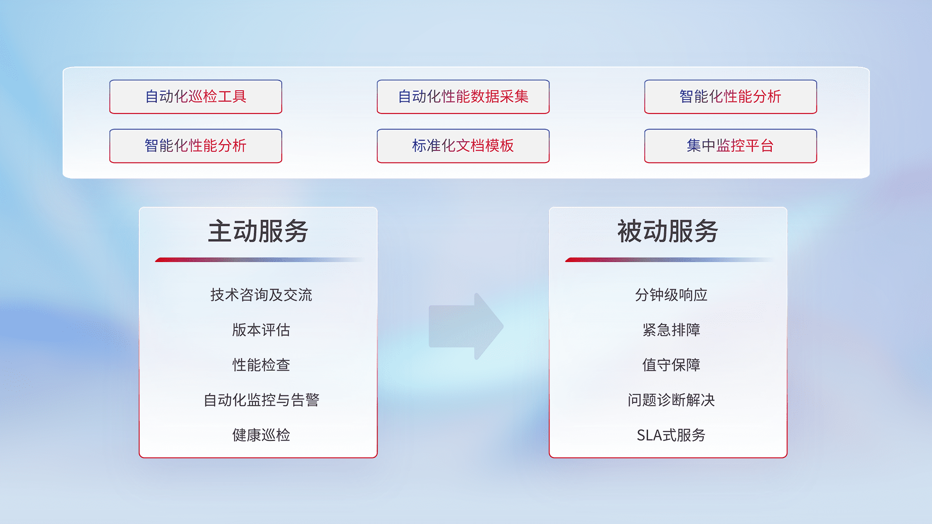 智能化工具和标准化文档,,保障服务质量,,提供主动服务(包含技术咨询、、版本评估、、、性能检查、、、自动化监控与告警、、健康巡检)和被动服务包含(分钟级响应、、紧急排障、、、、值守保障、、问题诊断解决、、、、SLA服务)。。。。